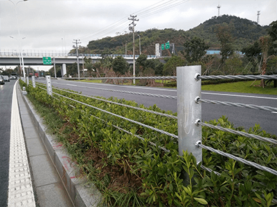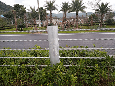 公路纜索護(hù)欄是柔性護(hù)欄的主要代表形式,它是一種以數(shù)根施加初張力的纜索固定于立柱上而組成的結(jié)構(gòu),它主要依靠纜索的拉應(yīng)力來抵抗車輛的碰撞,吸收碰撞能量。纜索護(hù)欄屬柔性結(jié)構(gòu),車輛碰撞時(shí)纜索在彈性范圍內(nèi)工作,可以重復(fù)使用,容易修復(fù)。立柱間距比較靈活,受不均勻沉陷的影響較小。風(fēng)景區(qū)公路采用纜索護(hù)欄較為美觀。積雪地區(qū),纜索護(hù)欄對(duì)掃雪的障礙稍少。但纜索護(hù)欄施工復(fù)雜,端部立柱損壞修理困難,不適合在小半徑曲線路段使用;同時(shí)它的視線誘導(dǎo)性較差,架設(shè)長(zhǎng)度短時(shí)不經(jīng)濟(jì)。